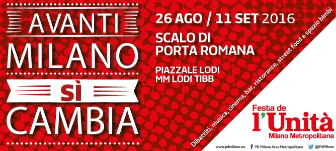 “Anche quest’anno ci ritroviamo insieme, col desiderio di ascoltare, confrontarci e progettare, con tanti temi in agenda: Europa, donne, Islam e laicità, populismi, legalità, riforma costituzionale e sicurezza urbana”. Così Pietro Bussolati alla conferenza stampa di presentazione della Festa de l’Unità di Milano, in programma dal 26 agosto all’11 settembre presso lo scalo di Porta Romana. Due palchi, uno intitolato “Altiero Spinelli” e l’altro “Enzo Jannacci”, per ospitare oltre 70 dibattiti, la “Libreria 25 Aprile” che accoglierà la presentazione di 34 libri, i concerti de I musici di Francesco Guccini, Dear Jack, Le sorelle Marinetti, Gli imbroglioni, Spazio Petardo, molti altri e lo spettacolo degli Youtubers con con Matt & Bise, Il Milanese imbruttito, Sebastian Gazzarini, FrenchMole, Shire&Skoob e Andrea Prada. Tra le novità di quest’anno il cinema all’aperto con la proiezione gratuita di sei pellicole: Io e lei, Il piccolo principe, Fuocammare, Il caso Spotlight, Perfetti sconosciuti e Il Ponte delle spie, l’area bimbi, sport e giostre e lo spazio “Casa del Sì” dedicato ai temi della riforma costituzionale. Non mancheranno la buona cucina del ristorante “I sapori de l’Unità”, il bar “Bella ciao, Milano”, il “Chiringuito” e i diversi stand di street food. “Lo slogan scelto per quest’anno è “Avanti Milano, Sì cambia” – ha spiegato il segretario Bussolati – perché il cambiamento non può che partire dai territori e Milano oggi ha una scommessa importante da vincere, confermare il suo ruolo di guida in Italia e in Europa, assieme a tutta l’area metropolitana”. Diciassette giorni di politica, cultura e attualità scanditi da 3 appuntamenti principali. Il primo, dedicato al tema dell’Islam, si svilupperà attraverso un seminario di formazione con Ilda Curti e Umberto Tavolato e due dibattiti con testimonianze dal mondo musulmano sulla costruzione di una società plurale. Il secondo grande tema è quello della riforma costituzionale, che troverà spazio sia in due momenti di formazione che in un dibattito al quale parteciperà, fra gli altri, la ministra delle riforme Maria Elena Boschi. Infine, Italia Chiamò: una due giorni, dal 9 al 10 settembre, con amministratori locali ed esponenti del governo, durante la quale si lavorerà su temi di respiro nazionale e la cui conclusione sarà affidata al sindaco Beppe Sala che salirà sul palco sabato 10. Dal 2 al 4 settembre, invece, spazio al dibattito nazionale sulla salute: Milano ospiterà la Festa nazionale su “Welfare e Salute” con l’intervento, fra gli altri, del ministro Beatrice Lorenzin.
