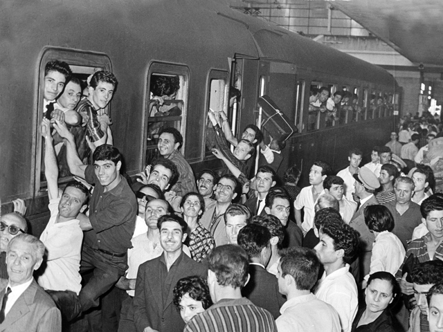 Dal 1951 al 1960 oltre due milioni di persone abbandonano il Mezzogiorno per trasferirsi nelle città del nord o all’estero. Si viaggia a bordo del treno del sole, il simbolo di quei viaggi che hanno unito il nord al sud dell’Italia. Si parte dalla Puglia, dalla Sicilia, dalla Campania, ma anche il settentrione ha i suoi emigranti. Il Sud diventa il serbatoio di manodopera per il triangolo industriale. Gli effetti sono immediati: le campagne si spopolano e le città si riempiono con evidenti problemi di sovraffollamento e insufficienza dei servizi. Si parte con in tasca l’indirizzo di un compaesano che può ospitarti in attesa di trovare un lavoro. Si vive in pensioni, in locande, a volte in soffitte e l’integrazione non è facile. Spesso i “meridionali” sono guardati con diffidenza e ci vorrà del tempo perché l’integrazione avvenga.