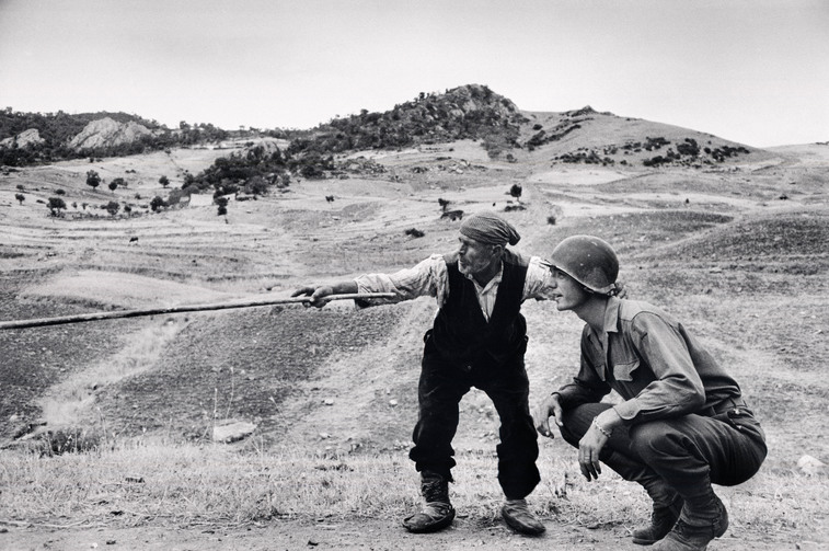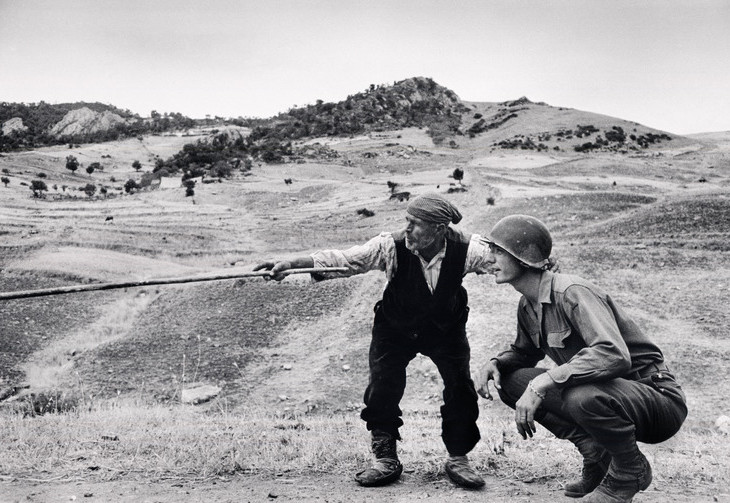 Immagine: ‘Contadino siciliano indica a un ufficiale americano la direzione presa dai tedeschi, nei pressi di Troina, Sicilia, 4-5 agosto 1943′.  Fonte: www.civita.it – sala stampa   Copyright: Didascalia © Robert Capa © International Center of Photography / Magnum Photos